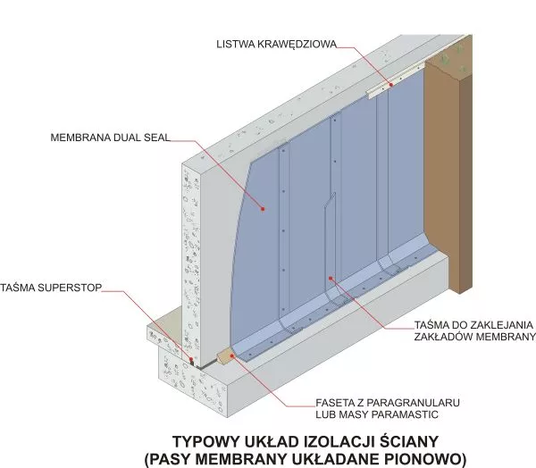 • montaż pasm membrany wodoszczelnej Dual Seal. Arkusze membrany mogą być montowane pasami poziomymi lub pionowymi