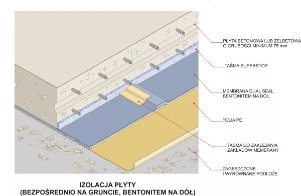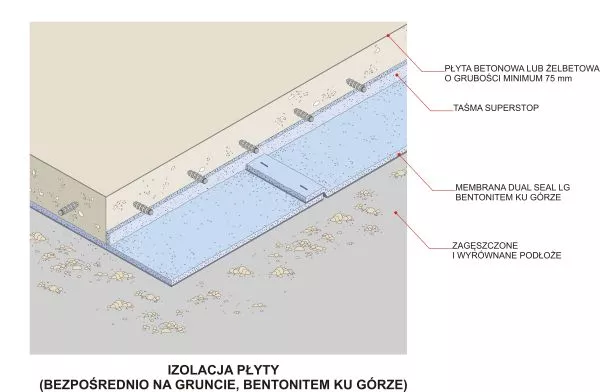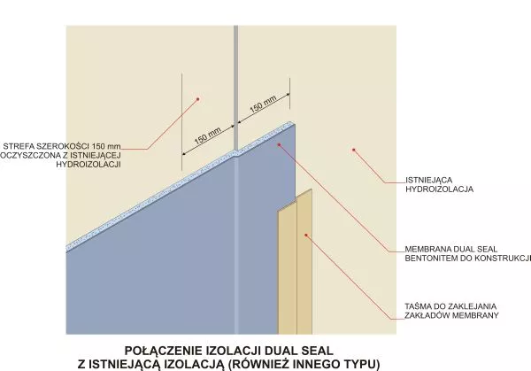 W systemie Dual Seal szczelność zakładów sąsiednich pasów membrany zapewnia bentonit.