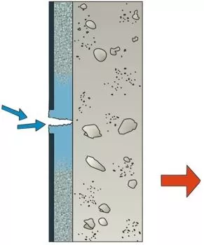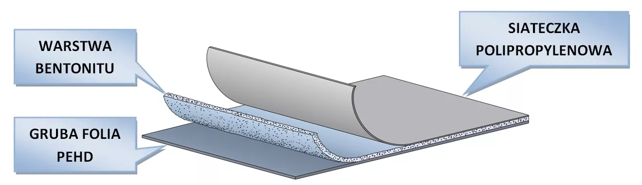 Szczelna, gruba i bardzo trwała folia HDPE jest pokryta wysokojakościowym bentonitem sodowym. Obydwa materiały uzupełniają się znakomicie tworząc wielowarstwową membranę wodoszczelną o grubości ~5 mm, która przy kontakcie z wodą samodoszczelnia się zamykając całkowicie dostęp wody do izolowanej konstrukcji (patrz rysunek poniżej).